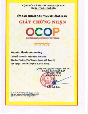 Theo quy trình chế biến, phải mất cả chục công đoạn lớn nhỏ để làm ra bánh. Đó là, dừa dày sau khi được nạo lấy cơm, rửa sạch, xắt lát mỏng, rồi trộn với đường trắng, nấu trong vòng 30 phút, tiếp tục tạo hỗn hợp, trộn với bột nếp, bột vani, tạo hình trong khuôn, rồi nướng bánh trong vòng 10 – 15 phút bằng máy sấy công suất lớn, ở điều kiện nhiệt độ 220 – 260oC. Sau khi cho ra thành phẩm, để nguội, đóng gói, có logo, nhãn mác, thương hiệu, mã vạch, tem truy xuất nguồn gốc, đăng ký bảo hộ sở hữu trí tuệ thương hiệu… Mỗi năm, cơ sở bánh kẹo Bảo Linh thu mua tới vài chục tấn dừa từ Quảng Nam, Bình Định mới đủ nguyên liệu phục vụ sản xuất. Năm 2019, sản phẩm bánh dừa nướng Bảo Linh đã được công nhận là sản phẩm OCOP cấp tỉnh, được xếp hạng 3 sao.